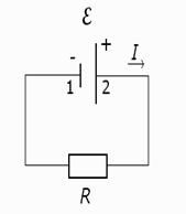 Электродвижущая сила (э.д.с.) Для того, чтобы в цепи шёл постоянный ток, цепь должна быть замкнута, и что-то в этой цепи должно постоянно генерировать электрическое поле. Это "что-то" и называется электродвижущей силой (э.д.с.) ε. Генерация поля (разности потенциалов на клеммах батареи на рисунке) осуществляется силами не электрической природы, например, за счёт химических реакций, продуктом которых является разделение зарядов, либо механическими и магнитными силами (гидро- и газогенераторы). Э.д.с. измеряется в вольтах, то есть это, по сути, не сила, а работа сторонних сил по перемещению единичного заряда против электрического поля (на рисунке положительные заряды внутри батареи должны быть перемещены от отрицательного контакта 1 к положительному 2, а во внешней цепи наоборот): Электрическое сопротивление Носители зарядов (электроны в металлах, ионы в электролитах) при своём движении сталкиваются с молекулами вещества проводника (с ионами кристаллической решётки в металлах, с другими ионами в электролитах). Направленное движение при этом замедляется – электрический ток испытывает сопротивление. Очевидно, что общее сопротивление R зависит от сечения проводника (чем оно больше, тем сопротивление меньше), от длины проводника (чем короче, тем сопротивление меньше), от вещества проводника. Если ввести так называемое удельное сопротивление ρ, зависящее только от материала, то можно записать для электрического сопротивления цилиндрического проводника: