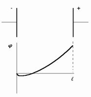 Если на два электрода, разделённых вакуумным промежутком ℓ, подать напряжение, в промежутке возникнет электрическое поле. Но где взять заряды? Только путём их эмиссии с электродов. Наиболее распространённый тип эмиссии – термоэлектронная эмиссия с катода. Если нагреть катод, электроны в нём получат дополнительную энергию, и часть из них будет способна преодолеть потенциальный барьер на границе металла (совершить работу выхода электрона) и выйти в межэлектродный промежуток. Попав в электрическое поле, электроны, ускоряясь, движутся к аноду, возникает электрический ток. В вакууме электронам не с чем сталкиваться, они не испытывают сопротивления движению. Казалось бы, при этом сколь угодно малое поле должно вызвать сколь угодно большой ток. Однако, в отличие от тока в средах, где всегда есть почти полная компенсация разноимённых зарядов (проводники электрически нейтральны), в вакууме отрицательный заряд электронного пучка ничем не скомпенсирован. Поэтому электроны движутся в поле, являющимся суперпозицией двух полей: поля, созданного зарядами на электродах и поля объёмного отрицательного заряда электронного пучка. Итоговое распределение потенциала между электродами схематично показано на рисунке. Вблизи катода, где концентрация электронов велика, существует потенциальный барьер для электронов величиной порядка их средней кинетической энергии (в электронвольтах – kT/e), который пропускает дальше в промежуток только часть электронов, обладающих энергией большей, чем глубина потенциальной ямы. Остальные электроны возвращаются назад. Подобная ситуация носит название "ограничение тока объёмным зарядом". Чем выше напряжение на аноде, тем меньше глубина ямы. Связь плотности тока j с анодным напряжением U получается следующей (e и m – элементарный заряд и масса электрона, соответственно):