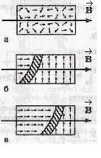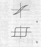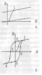 Если теперь уменьшать токв соленоиде, т.е., H, то В будет уменьшаться, но не до нуля, так как при H = 0 достаточно сильная остаточная индукция ВОСТ (точка 2 на рис. б) получается за счет спонтанного намагничивания куска ферромагнетика. Этот кусок можно вынуть из катушки, он будет более или менее долго намагниченным. Это постоянный магнит. Если железный сердечник оставить в соленоиде, а ток соленоида пустить в обратную сторону, то остаточная индукция ВОСТ исчезает при некотором отрицательном НК ( коэрцитивная сила, точка 3 на рис. б). Затем будет происходить намагничивание до насыщения в противоположном направлении (точка 4). Если снова уменьшать H до нуля и затем увеличивать в положительном направлении, то мы пойдем не по пути 4 → 3→ 2 → 1, а по пути 4 → 5 (остаточное намагничивание в противоположном направлении) → 6 (положительная коэрцитивная сила НК) → 1. Так что зависимость B от Н не только нелинейная, но и неоднозначная. Это явление носит название гистерезиса, а получающаяся петля (рис. б) называется петлей гистерезиса. В разных материалах форма петли гистерезиса разная. На рис. показаны петли гистерезиса для чистого железа (а) и для сплавов, из которых делают постоянные магниты (б).