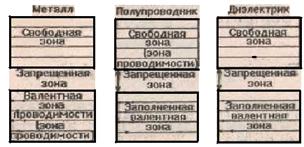 Таким образом, спектр возможных энергий электронов в кристалле представляет собой чередование разрешенных и запрещенных зон. По характеру заполнения зон все тела можно разделить на две группы. У первой группы над целиком заполненными зонами располагается зона, заполненная лишь частично. Такое заполнение характерно для металлов. Ко второй группе относятся тела, у которых над полностью заполненными зонами располагаются пустые зоны. Такое заполнение характерно для диэлектриков. У диэлектриков с малой шириной запрещенной зоны возможен тепловой переброс части электронов из заполненной валентной зоны в свободную зону и образование «пустых» мест – положительно заряженных «дырок» – в валентной зоне. Такие вещества называются полупроводниками. С точки зрения зонной теории вещество является проводником, если в разрешенной зоне имеются: 1) электрические заряды и 2) незаполненные энергетические уровни. Тогда при помещении во внешнее электрическое поле электроны совершают направленное упорядоченное движение, переходя на все более высокие уровни, получая энергию от электрического поля.. Приведенным выше условиям удовлетворяют металлы (в них электроны перемещаются в валентной зоне, которая для них является зоной проводимости) и полупроводники, у которых происходит движение электронов в свободной зоне – зоне проводимости и «дырок» – в валентной зоне. Кроме чистых полупроводников в электронных приборах используются примесные полупроводники: донорные или n -типа, в которых энергетические уровни примесных атомов, содержащие электроны, располагаются вблизи дна свободной зоны и поставляют в нее электроны за счет теплового возбуждения и акцепторные или p -типа, в которых незаполненные уровни примесных атомов располагаются вблизи верхней границы валентной зоны и могут принимать из нее электроны, приводя к возникновению в этой зоне «дырок». Возможны также полупроводники со смешанной дырочно-акцепторной проводимостью, в которых электрический ток представляет одновременное движение электронов в свободной зоне и «дырок» в валентной зоне. Зонная теория позволила объяснить увеличение проводимости полупроводников при увеличении температуры: за счет теплового возбуждения возрастает число носителей тока – электронов в свободной зоне и «дырок» в валентной.