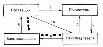Рис. 2.6. Расчеты платежными требованиями-поручениями: 1) - поставка товара (оказание услуг); 1а) - передача платежного требования-поручения в банк покупателя; 2) - расчетные документы передаются покупателю для акцепта; 3) - акцептованные расчетные документы возвращаются в банк, где производится списание средств со счета покупателя; 4) - перевод средств в банк поставщика и зачисление их на счет поставщика; 5) - сообщение поставщику о зачислении средств на его банковский счет.