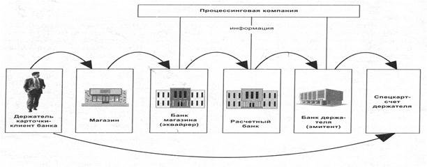 Основная функция любой карточки - идентификация ее предъявителя.Первое теоретическое обоснование возможности использования карточки как платежного средства появилось в Англии в конце прошлого века. Идею выдвинул в 1880 г. Джеймс Беллами. Пионерами в области практической реализации идеи оказались США. С конца 19 века в Соединенных Штатах стало бурно развиваться кредитование частных лиц и, как свидетельствует история, первая кредитная карточка была выпущена в 1914г. фирмой General Petroleum Corporation of California. Первые карты не были платежными в современном понимании - они лишь подтверждали принадлежность пользователя к той или иной системе учреждений сферы обслуживания. К тому же они имели строго ограниченную сферу действия как по видам услуг, так и географически. Впервые кредитную схему под названием “Charge-it” организовал в 1946г. Джон С. Биггинс, специалист по потребительскому кредиту из национального банка Флетбуш в нью-йоркском районе Бруклин. Его схема расчетов предусматривала расписки, которые принимались от клиентов местными магазинами за мелкие покупки. Магазин сдавал расписки в банк, который оплачивал их со счетов покупателей. Так была опробована классическая цепочка расчетов, используемая сейчас в банковском карточном бизнесе. Первой массовой платежной карточной системой в ее современном понимании считают “Дайнерс клаб” (Diners Club), которую основали в 1949-1950гг. Альфред Блумингдейл, Фрэнсис Макнамара и Ральф Снайдер. Целью создания компании был выпуск платежных карточек, принимаемых в оплату за обслуживание в ресторанах, отелях, туристических агентствах. Ее принципиальное отличие от предшествующих систем было в том, что между покупателями и продавцами товаров и услуг появилась посредническая организация, которая взяла на себя проведение расчетов. Это была первая полномасштабная схема трехстороннего соглашения с участием эмитента карточки, торгового предприятия и владельца карточки. Пластиковые карточки можно классифицировать по критериям: 1. По назначению карты делят на идентификационные, информационные, карточки для финансовых операций (расчетов). 2. По материалу, из которого они изготовлены различают карты бумажные (картонные), пластиковые, металлические. 3. По способу записи информации на карту: · графическая запись; · эмбоссирование; · штрих-кодирование; · кодирование на магнитной полосе; · запись в микросхему (chip); · лазерная запись (оптические карты). При осуществлении расчетов с помощью карты приводится в действие следующая схема (см. рис. 2.7.). Держатель карты предъявляет ее продавцу товара или услуги. Продавец осуществляет проверку подлинности карты, затем проводит авторизацию, т.е. запрашивает платежную систему о полномочиях предъявителя карты и его финансовых возможностях. Технология авторизации зависит от схемы платежной системы (дебетовая, кредитная), типа карты (с магнитной лентой или смарт-карта) и технической оснащенности точки обслуживания (телефон или POS-терминал). Авторизация может проводиться “вручную”, когда оператор или кассир передает запрос по телефону (голосовая авторизация), или автоматически через банкомат или торговый терминал. POS-терминалы (Point of sale) предназначены для обработки транзакций при финансовых расчетах с использованием пластиковых карт с магнитной полосой и смарт-карт. POS-терминалы по