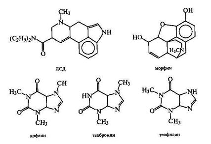 Алкалоиды — весьма обширный класс органических соединений, оказывающих самое различное действие на организм человека. Это и сильнейшие яды, и полезные лекарственные средства. Печально известный наркотик, сильнейший галлюциноген — ЛСД — диэтил-амид лизергиловой кислоты, был выделен из спорыньи, грибка, растущего на ржи, в 1943 г. швейцарским химиком А. Гофманом. С 1806 г. известен морфин, он выделен из сока головок мака и является очень хорошим обезболивающим средством, благодаря чему нашел применение в медицине, однако при длительном употреблении приводит к развитию наркомании. Хорошо изучены в настоящее время так называемые пуриновые алкалоиды, к которым относятся кофеин и часто сопровождающие его теобромин и теофиллин. Структурные формулы кофеина, теобромина и теофилина представлены ниже.