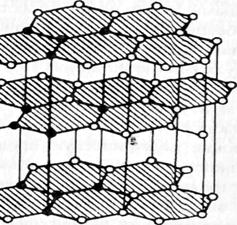 Рис. 1.18. Атомы углерода в графите связаны друг с другом так, что образуют плоские двухмерные слои, где они связаны друг с другом за счет sp2-гu6puдных орбиталей. У которых валентные углы связей равны 120°, а длина связи С—С в плоскости равна 0,142 нм. В этом слое у каждого атома имется один нелокализованный электрон, участвующий в образовнии p - связи. Электропроводность графита – следствие переноса тока этими электронами. Двухмерные слои связаны друг с другом слабыми силами Ван-дер-Ваальса. Кристалл графита в направлении этой оси имеет низкую прочность и является изолятором. Таким образом графит является ковалентным кристаллом в одном направлении и молекулярным в другом. Четвертый валентный электрон (р - электрон) каждого атома вступает в p -связь с соседними атомами.