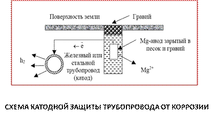 Рис. 5.5. Протекторная защита заключается в образовании гальванической пары, в которой защищаемый металл играет роль катода, а анодом (протектором) служит более активный металлов. В качестве протектора используют металлы с низким потенциалом (Al, Mg, Zn). Протекторы соединяют металлическим проводом с защищаемой конструкцией. Изменение свойств коррозионной среды сводится к снижению агрессивности среды. В нейтральной среде коррозия протекает с поглощением кислорода. Для удаления О2 производят деаэрацию (кипячение, барботаж инертным газом). Агрессивность среды можно уменьшить снижением концентрации ионов H+, т.е. подщелачиванием. Для защиты от коррозии используют ингибиторы, вещества, при добавлении которых в среду, где находится металл, уменьшится скорость коррозии. Рациональным конструированием изделий можно снизить коррозию, исключив наличие особо опасных участков в конструкциях (сварных швов, узких щелей и т.д.).