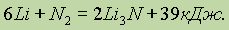 Этим объясняется малая реакционная способность азота при обычной температуре (сравните с О2 и Cl2). Химические свойства. Для того чтобы азот вступил в химическую реакцию, требуется предварительная активация его молекул нагреванием, облучением или другими способами. Из металлов азот реагирует в обычных условиях только с литием, образуя нитрид: