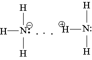 Видно, что из четырех электронных пар при азоте три общие (связывающие) и одна неподеленная (несвязывающая). Химическая связь N—Н полярная: положительный заряд сосредоточен на атомах водорода, отрицательный — на атоме азота. Вследствие этого между молекулами аммиака и образуется водородная связь, что можно изобразить так: