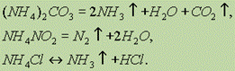 Все аммонийные соли растворимы в воде и при этом гидролизуются. Соли аммония термически неустойчивы и при нагревании разлагаются:
