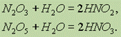 Оксиды азота. В оксидах азота степень его окисления меняется от 1+ до 5+. Оксиды N2O и NO—- бесцветные газы, оксид азота (IV) NO2 — бурый газ, получивший в промышленности название “лисий хвост”. Оксид азота (III) N2O3 — синяя жидкость, оксид азота (V) N2O5 при обычных условиях — прозрачные бесцветные кристаллы. Оксиды N2O и NO не реагируют c водой и щелочами, тогда как N2O3 и N2O5, являясь ангидридами, при взаимодействии с водой дают соответствующие кислоты: