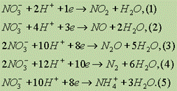 Азотная кислота принадлежит к числу наиболее сильных кислот, и для нее характерны все реакции, в которые вступают кислоты, — с основаниями, основными оксидами и т. д. Специфическим свойством азотной кислоты является ее ярко выраженная окислительная способность. Сущность окисления различных веществ азотной кислотой заключается в том, что ион NO3, имеющий в своем составе азот в степени окисления 5+, в зависимости от условий (концентрации кислоты, природы восстановителя, температуры) может принимать от одного до восьми электронов. Восстановление аниона NO3 в связи с этим может протекать до различных веществ: