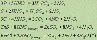 Какое из этих веществ образуется, т. е. насколько глубоко произошло восстановление азотной кислоты, в каждом конкретном случае зависит от природы восстановителя, от условий протекания реакции и от концентрации самой кислоты. При прочих равных условиях образование тех или иных продуктов восстановления азотной кислоты зависит от концентрации. Азотная кислота обладает окислительной способностью при любой концентрации, при этом, однако, чем концентрированнее HNO3, тем менее глубоко она восстанавливается. С одним и тем же восстановителем, например цинком, кислота, если она концентрированная, будет обязательно реагировать по схеме(1) с выделением NO2; если HNO3 разбавленная, то она может взаимодействовать с Zn по любой схеме (2—5), в зависимости от степени разбавления. Чтобы восстановление HNO3 провести наиболее глубоко, необходимо использовать максимально разбавленную кислоту, применять сильный восстановитель и реакцию вести на холоде. При использовании более концентрированной кислоты низшие оксиды азота (образованные в ходе реакции) окисляются концентрированной кислотой до высших. Азотная кислота взаимодействует со всеми металлами, за исключением Au, Pt, W. Концентрированная HNO3 не взаимодействует при обычных условиях также с Fe, Al и Сr, которые она пассивирует, однако при очень сильном нагревании HNO3 взаимодействует и с этими металлами. Большинство неметаллов и сложных веществ восстанавливают HNO3, как правило, до NO (реже до NO2):