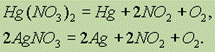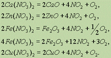 Третью группу составляют нитраты наиболее тяжелых металлов, разлагающиеся до свободного металла, NO2 и кислорода: