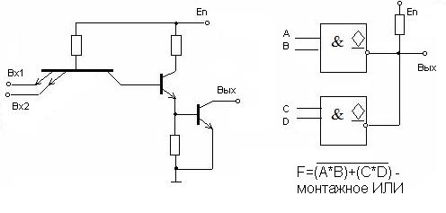 Если две стандартные схемы ТТЛ логики соединить вместе по выходу и на первом выходе будет 1, а на другом 0, то они сгорят. Для того, чтобы можно было соединить несколько выходов применяются схемы с открытым коллектором. Если два и более выхода с открытым коллектором соединены параллельно, то достаточно одного согласующего регистра и схема будет работать. 2. Схема с тремя состояниями