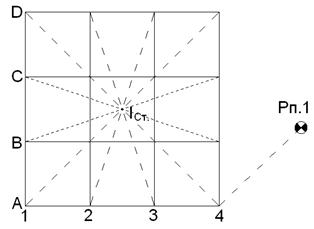 Нивелирование поверхности производится на местности со слабо выраженным рельефом для получения крупномасштабного топографического плана участка, отведенного под строительство. Существует два способа нивелирования поверхности: по квадратам и по магистралям. Нивелирование по квадратам. На открытой местности с помощью теодолита и стальной ленты разбивают сетку квадратов (рис. 8.7.1.) со сторонами 10,20,30 и 50 м, в зависимости от сложности рельефа. Вершины квадратов закрепляют кольями. Одновременно с разбивкой сетки квадратов ведут съемку ситуации преимущественно способом створных промеров по сторонам сетки.