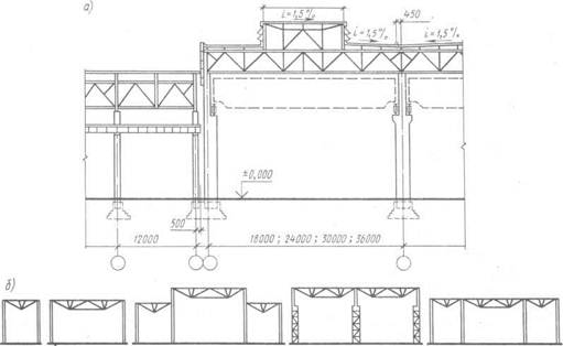 Рис. 7.2. Стальной каркас одноэтажного производственного здания: а - из стандартных унифицированных элементов; 6 - то же, из легких несущих конструкций комплектной поставки
