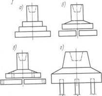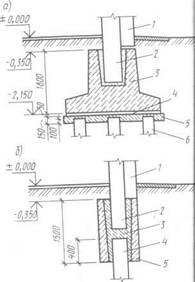 Дно стакана фундамента располагают на 50 мм ниже проектной отметки низа колонн, с тем, чтобы подливкой раствора под колонну компенсировать возможные неточности размеров высоты колонн, допускаемые при их изготовлении, и выровнять верх всех колонн. Рациональным решением конструкции фундаментов ступенчатой формы «стаканного» типа (рис. 7.3, 1,в, г) является такое, при котором независимо от глубины их заложения отметка верха подколонника остается постоянной. Это легко достигается некоторым увеличением высоты подколонника, при малом заглублении фундаментов колонн фундамент должен иметь отметку верхней плоскости 0,15 м или быть ниже уровня пола на 150 мм, т.е. на толщину его бетонной подготовки. В случае необходимости большего заглубления фундамента его конструкция усложняется, так как возникает потребность в дополнительном сборном элементе - вставке (банкете), на который устанавливают колонну. Фундаменты производственных зданий при соответствующем технико-экономическом обосновании устраивают свайными. Рекомендуется для производственных зданий применять прогрессивные виды свай: забивные (без поперечного армирования, составные, пирамидальные, ромбовидные, булавовидные, сваи-колонны), буронабивные и др. Такое решение конструкций фундаментов под колонны не зависит от заложения смежных фундаментов под оборудование; малый объем земляных работ дает возможность вести строительство без отрывки котлованов, что сокращает сроки строительства, исключает осадку грунта и пола здания, обеспечивает возможность монтажа оборудования сразу же после окончания устройства фундамента и пр. На рис. 7.4, а, б показана конструкция свайного фундамента с монолитным и сборным ростверком.