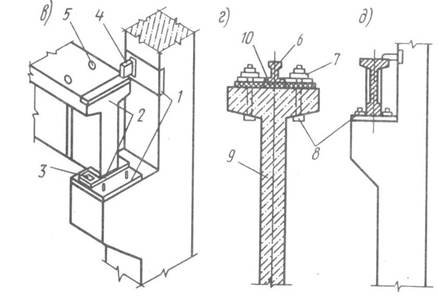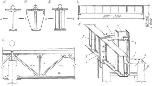 Рис. 7.18 а, б, в — сплошного сечения; г — решетчатого типа; д — схема балок сплошного сечения; е — опирание на стальную колонну; 1 — торцовое ребро; 2 — подкрановая балка; 3 — ребро жесткости; 4 — крепление планки; 5 — надколонник; 6 — фасонка; 7 — опорный лист траверсы; 8,9 — подкрановые ветви колонны