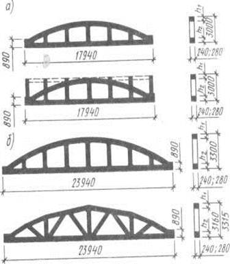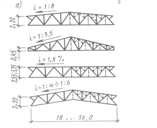 Рис. 7.20. Схемы и узлы стальных ферм покрытия: а - типы стропильных и подстропильных ферм.