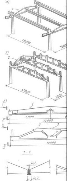 В производственных зданиях рекомендованы эффективные железобетонные предаварительно напряженные несущие конструкции (из высокопрочных тяжелых и легки бетонов с применением высокопрочной арматурной стали) с малой материалоемкостью и трудоемкостью. Стальные конструкции целесообазно применять при соответствующих климатических условиях (на Крайнем Севере и в некоторых других районах при отсутствии заводов сборного железобетона, с учетом конкретных условий строительства и его уроков. При стальном каркасе конструктивные схемы в основном аналогичны схемам из железобетона и определяются сочетанием основных элементов здания - балок, ферм, колонн, связанных в единое целое (рис. 7.2).