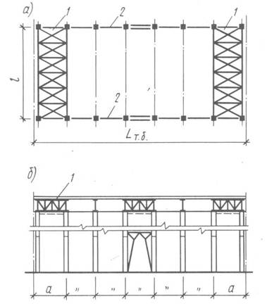Рис. 7.13. Схема расположения связей покрытия при железобетонном каркасе в пределах температурного блока: а - горизонтальных по нижнему поясу ферм (балок); б - вертикальных между несущими конструкциями покрытия; 1 - связевая ферма; 2 – распорка. Стальной каркас. Стальные каркасы применяют при строительстве предприятий металлургии, машиностроения и других в цехах при крупных пролетах и значительных крановых нагрузках. В большинстве других производственных зданий по указанию ТП 101—81 применяют сборный железобетонный каркас. Согласно требованиям ТП 101—81 колонны, балки, стропильные, подстропильные и другие конструкции надлежит выполнять с применением широкополочных двутавров и тавров. За последние годы проведены большие работы по созданию типовых стальных конструкций, имеющих малую материалоемкость и трудоемкость, усовершенствованы конструкции для покрытий зданий, разработаны типовые конструкции зданий с использованием стального профилированного настила и эффективных утеплителей, а также типовые узлы стальных конструкций покрытий.