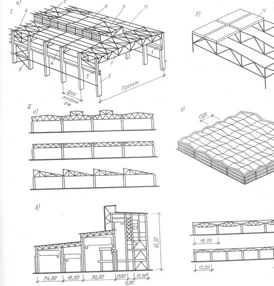 Рис. 7.14 Схемы стальных каркасов одноэтажных производственных зданий: I - однопролетного: а - общий вид; б - опирание ферм покрытия на подстропильную конструкцию;1 - фермы (ригель); 2 - колонна рамы; 3 – подкрановая балка; 4 – ригель; 5 - вертикальные связи между еолоннами; 6 – вертикальные связи покрытия; 7 – горизонтальные связи покрытия; 8 – фонарь; 9 – связи фонаря; 10 – прогоны; 11 – панель покрытия; П – многопролетного: а – с легким режимом работы; б – то же с тяжелым; в – с покрытием оболочкой двоякой кривизны по стальным фермам.