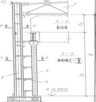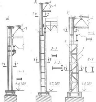 Рис. 7.17. Стальные колонны: а - сплошная постоянного сечения; б — то же, переменного; в - то же, сквозная; г — раздельного типа; 1 - ферма; 2 - шатровая ветвь; 3 - то же, подкрановая; 4 - диафрагма жесткости.