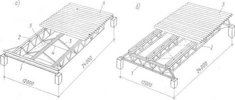 Рис. 7.21. Блок покрытия с использованием профилированного настила: а — первый тип; 1— подстропильная балка; 2 — стропильная ферма; 3 — подкос; 4 — затяжка; 5 — прогон; 6 —профилированный настил; б — второй тип; 1— подстропильная ферма; 2 — стропильная ферма; 3 — профилированный настил