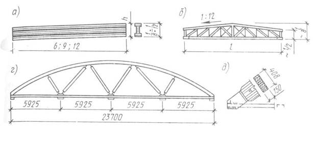 Рис. 7.22. Деревянные несущие конструкции покрытий: а, 6, в — клееные балки и фермы; г — то же, металлодеревянная ферма; д — то же, узлы фермы