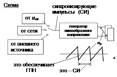 ГПН генерирует пилообразное напряжение частотой приблизительно кратной частоте uвх. СИ обеспечивают точную кратность частот. Математическая модель должно быть для устойчивости изображени Тр/T = N, N=1, 2, 3… -целое число. N – количество периодов uвх, видимых на экране.