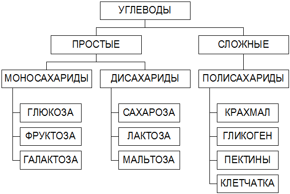 Простые углеводы УГЛЕВОДЫ И ИХ ЗНАЧЕНИЕ В ПИТАНИИ Углеводы являются основной составной частью пищевого рациона. Физиологическое значение углеводов определяется их энергетическими свойствами. Каждый грамм углеводов обеспечивает поступление 16,7 кДж (4 ккал). Углеводы используются в организме также в качестве пластического материала, для биологического синтеза, входят в состав структур многих клеток и тканей. Например, глюкоза постоянно содержится в крови, гликоген — в печени и мышцах, галактоза входит в состав липидов мозга, лактоза — в состав женского молока. В организме углеводы депонируются ограниченно и запасы их невелики. Поэтому для удовлетворения потребностей организма углеводы должны поступать бесперебойно в составе пищи. Углеводы тесно связаны с обменом жира. Избыточное поступление в организм человека углеводов при недостаточной физической нагрузке человека способствует превращению углеводов в жир. В естественных пищевых продуктах углеводы представлены в виде моно-, ди- и полисахаридов. В зависимости от строения, растворимости, быстроты усвоения и использования для гликогенообразования углеводы пищевых продуктов могут быть представлены в виде следующей схемы: