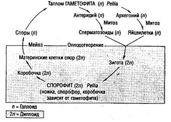 К высшим растениям относятся мхи, риниофиты (полностью вымершие), плауны, хвощи, папоротники, голосеменные и покрытосеменные (цветковые). В циклах развития всех высших растений существует два поколения — половое (гаметофит) и бесполое (спорофит). Это явление называется сменой поколений. Отдел Моховидные. Мхи — древняя, наиболее примитивная группа высших растений. Возраст ископаемых остатков 400 млн лет. Моховидных около 27 тыс. видов, на территории Беларуси из них встречается около 400 видов. Мхи — низкорослые растеньица, произрастающие на болотных кочках, сырых лугах, в хвойных лесах, на стволах деревьев, в горах. Моховидные — это небольшие (от нескольких миллиметров до нескольких сантиметров), преимущественно многолетние фотосинтезирующие растения. Тело их состоит из простых или разветвленных стеблей с листочками; у печеночных мхов тело представляет собой слоевище. Моховидные не имеют корней и прикрепляются к субстрату с помощью ризоидов. Ризоидами (это вытянутая клетка или несколько клеток в нижней части стебля) мхи поглощают из почвы воду и минеральные соли. У моховидных формируются покровные и проводящие ткани, но нет механических тканей, нет настоящих сосудов. Моховидные имеют многоклеточные органы полового размножения. Различают листостебельные и печеночные мхи. Листостебельные мхи подразделяются на Зеленые мхи и Сфагновые. Представителем зеленых мхов является кукушкин лен. Растение кукушкин лен достигает в высоту 12—20 см. Стебель тонкий, направлен вверх. На стебле густо расположены узкие зеленые листья. Кукушкин лен — раздельнополое растение. Мужские растения имеют на верхушке красноватые листочки, между которыми находятся мешочки — мужские органы полового размножения — антеридии. В них развиваются сперматозоиды, имеющие по два, жгутика. На верхушке стебля женского растения между листьями расположены архегоний. Архегоний имеет колбообразную форму, в расширенной части находится яйцеклетка — неподвижная округлая женская гамета. Растение, на котором образуются половые клетки — гаметы, называется гаметофитом. Мужские и женские растения растут рядом. При наличии капель воды (дождя, росы) сперматозоиды передвигаются в воде и достигают архегониев, где мужские и женские гаметы сливаются. Образуется зигота. Это — половое размножение. На следующий год зигота, не выходя из архегония, начинает делиться и из нее на верхушке женского растения на длинной безлистной ножке развивается коробочка, покрытая волосистым колпачком. В нижней части ножки образуется присоска, которая поглощает из женского растения органические вещества. Коробочка представляет собой спорангий. Внутри — множество мелких спор. Коробочка с ножкой называется спорофитом. Когда споры созревают, они высыпаются и рассеиваются ветром. Попав в благоприятные условия, споры прорастают. Это — бесполое размножение. В почве из проросшей споры развивается длинная тонкая ветвящаяся нить зеленого цвета, напоминающая зеленую водоросль — протонема. В дальнейшем на нитях образуются почки, из которых вырастают покрытые листьями молодые растения кукушкина льна. У мохообразных доминирует поколение гаметофитов, у всех остальных наземных растений — поколение спорофитов (рис.1).