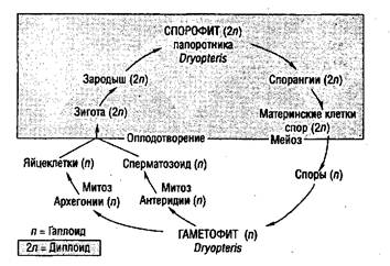 Гаметы у растений образуются не в результате мейоза, как у животных, а в результате митоза; мейотическое деление происходит при образовании спор. Отдел Риниофиты. Риниофиты — первые наземные сосудистые растения. Они жили более 400 млн лет тому назад и затем вымерли. Ископаемые остатки этих растений были найдены недалеко от деревни Райни в Шотландии. На латинском языке название деревни Риние (Rhynie). Отдел Риниофиты включает споровые растения, представляющие собой простые ветвящиеся веточки со спорангиями на верхушках. Листья отсутствуют. Представитель — риния. Это кукушкин лен — раздельнополое растение. Мужские растения имеют на верхушке красноватые листочки, между которыми находятся мешочки — мужские органы полового размножения — антеридии. В них развиваются сперматозоиды, имеющие по два, жгутика. На верхушке стебля женского растения между листьями расположены архегоний. Архегоний имеет колбообразную форму, в расширенной части находится яйцеклетка — неподвижная округлая женская гамета. Растение, на котором образуются половые клетки — гаметы, называется гаметофитом. Мужские и женские растения растут рядом. При наличии капель воды (дождя, росы) сперматозоиды передвигаются в воде и достигают архегониев, где мужские и женские гаметы сливаются. Образуется зигота. Это — половое размножение. На следующий год зигота, не выходя из архегония, начинает делиться и из нее на верхушке женского растения на длинной безлистной ножке развивается коробочка, покрытая волосистым колпачком. В нижней части ножки образуется присоска, которая поглощает из женского растения органические вещества. Коробочка представляет собой спорангий. Внутри — множество мелких спор. Коробочка с ножкой называется спорофитом. Когда споры созревают, они высыпаются и рассеиваются ветром. Попав в благоприятные условия, споры прорастают. Это — бесполое размножение. В почве из проросшей споры развивается длинная тонкая ветвящаяся нить зеленого цвета, напоминающая зеленую водоросль — протонема. В дальнейшем на нитях образуются почки, из которых вырастают покрытые листьями молодые растения кукушкина льна. У мохообразных доминирует поколение гаметофитов, у всех остальных наземных растений — поколение спорофитов (рис.1). Гаметы у растений образуются не в результате мейоза, как у животных, а в результате митоза; мейотическое деление происходит при образовании спор. Отдел Риниофиты. Риниофиты — первые наземные сосудистые растения. Они жили более 400 млн лет тому назад и затем вымерли. Ископаемые остатки этих растений были найдены недалеко от деревни Райни в Шотландии. На латинском языке название деревни Риние (Rhynie). Отдел Риниофиты включает споровые растения, представляющие собой простые ветвящиеся веточки со спорангиями на верхушках. Листья отсутствуют. Представитель — риния. Стебель дихотомически ветвился. Нижняя часть стебля представляла собой корневище с пучками ризоидов. Наземные стебли ринии высотой 20—50 см, толщиной 3—6 мм были покрыты кутикулой и являлись органами фотосинтеза. По внутреннему строению риния похожа на современные высшие сосудистые растения. На верхушке стебля развивались спорангии, в которых образовывались споры. Папоротниковидные. Папоротники — травянистые растения, реже — деревья с большими раскидистыми листьями. Папоротник