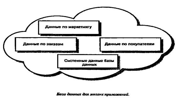 Сведения об архитектуре Oracle, относятся ко всем платформам, на которых работает Oracle. Отличия в платформах обусловливают отличия в архитектуре, но основа всюду одна. Что такое база данных? База данных — собрание данных, между которыми существуют (смысловые) связи. Эти данные используются вместе одной или несколькими прикладными системами. Физическое расположение и реализация базы данных прозрачны для прикладных программ; физическую базу данных можно перемещать и реорганизовывать и это не окажет влияния на работоспособность программ. Следующий рисунок иллюстрирует понятие базы данных, содержащей данные для многих (возможно, несвязанных) приложений.