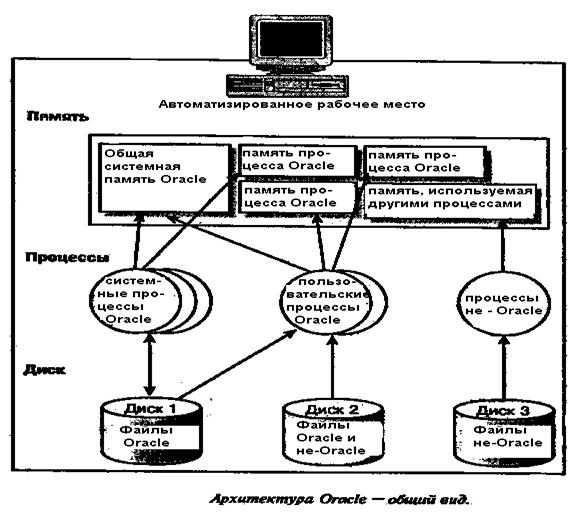 Физически база данных Oracle — не более чем набор файлов где-то на диске. Расположение этих файлов несущественно для функционирования (хотя важно для производительности) базы данных. Это двоичные файлы, к которым обращаются только через программное обеспечение ядра Oracle. Запрос данных из файлов БД обычно выполняется одним из инструментальных средств Oracle (таких как SQL*Plus), использующих структурированный язык запросов (SQL). Логически база данных — это множество пользовательских разделов Oracle, каждый из которых идентифицируется именем пользователя (с паролем), уникальным в данной БД. Таблицы и другие объекты принадлежат некоторому пользователю Oracle. Доступ к СУБД возможен только после регистрации посредством ввода имени и пароля пользователя. Если введенные имя и пароль не проходят проверку на соответствие, доступ к БД не предоставляется. Имя и пароль пользователя СУБД Oracle отличаются от имени и пароля пользователя операционной системы. Например, если база данных работает Ha UNIX машине, то необходимо сначала зарегистрироваться в UNIX, используя имя и пароль для операционной системы UNIX, а затем зарегистрироваться в Oracle и лишь тогда можно "увидеть" объекты базы данных. (Регистрация в UNIX может не требоваться при соответствующей настройке системы клиент/сервер.). Эта процедура регистрации, или подключения к БД, выполняется всегда независимо от того, используются для доступа к серверу-СУБД инструментальные средства Oracle или других изготовителей. Таблицы с одинаковыми именами могут существовать в двух разных учетных разделах Oracle; хотя имя у них одно, это — разные таблицы. Иногда одну БД (один набор физических файлов базы данных) используют для хранения различных версий таблиц (в отдельных учетных разделах Oracle) для разработчиков, тестирования системы или обучения пользователя; иногда одно имя таблицы используется в различных прикладных системах. Часто учетный раздел пользователя Oracle называют базой данных, но это не совсем правильно. Можно, например, создать два учетных раздела Oracle, чтобы хранить данные для двух совершенно различных прикладных систем; получились бы две логические базы данных, реализованные в одной физической базе данных.