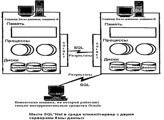 В простой конфигурации Oracle файлы базы данных, структуры памяти, фоновые и пользовательские процессы располагаются на одной машине без использования сети. Однако намного чаще встречается конфигурация, когда БД расположена на машине-сервере, а инструментальные средства Oracle — на другой машине (например, PC с Microsoft Windows). При такой клиент/серверной конфигурации машины связываются посредством некоторого сетевого программного обеспечения (не относящегося к семейству ПО Oracle), которое позволяет двум машинам поддерживать связь. Также требуется организовать диалог между двумя базами данных на различных машинах — например, есть обращение к таблицам из обеих баз данных в одной транзакции или даже в одном операторе SQL. Кроме того, здесь две машины нуждаются в программном обеспечении (разработанном не-Oracle) для организации сети и поддержания связи. Какой бы тип сетевого ПО и набор протоколов не использовались для связи машин (например, TCP/IP) с целью организации взаимодействия клиент/сервер или сервер-сервер, нужно иметь программный продукт Oracle SQL*Net, который позволяет СУБД Oracle взаимодействовать с сетевым протоколом. SQL*Net поддерживает большинство сетевых протоколов для локальных вычислительных сетей PC (таких как IPX/SPX) и для мэйнфреймов (например, SNA). По существу, SQL'Net является промежуточной программной прослойкой между Oracle и сетевым ПО, обеспечивающей связь между клиентской машиной Oracle Сна которой работает, например, SQL*Plus) и сервером базы данных или между серверами баз данных. ПО SQL*Net устанавливается на обеих машинах "поверх" сетевого программного обеспечения. Опции SQL*Net позволяют одной машине работать с одним сетевым протоколом, сообщаясь с другой машиной, работающей с другим протоколом. При изменениях сетевых протоколов или сетевого ПО не придется изменять программное обеспечение прикладной системы. При необходимости можно выполнить изменения, установив другую версию SQL*Net для нового сетевого протокола. На следующем рисунке показано место SQL*Net в среде клиент/сервер с двумя серверами базы данных.
