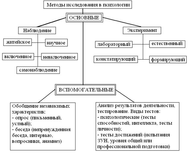 Эксперимент – метод, предполагающий активное вмешательство исследователя в деятельность испытуемого с целью создания наилучших условий для изучения конкретных психологических явлений. Эксперимент может быть лабораторным, когда он протекает в специально организованных условиях, а действия испытуемого определяются инструкцией; естественным, когда изучение осуществляется в естественных условиях, причем люди не знают, что над ними проводится эксперимент; констатирующим, когда изучаются лишь необходимые психологические явления; формирующим – в процессе которого развиваются определенные качества испытуемых. Метод обобщения независимых характеристик предполагает выявление и анализ мнений о тех или иных психологических явлениях и процессах, полученных от различных людей. Опрос – метод, предлагающий ответы испытуемых на конкретные вопросы исследователя. Он бывает письменным (анкетирование), когда вопросы задаются на бумаге; устным, когда вопросы задаются устно. Беседа как психологический метод предусматривает прямое или косвенное, устное или письменное получение от изучаемого сведений о его деятельности, в которых объективируются свойственные ему психологические явления. Беседа характеризуется непринужденностью, ее нельзя превращать в опрос. Важно продумать беседу, представить ее в форме плана, задач, проблем, подлежащих выяснению. Беседа предполагает наряду с ответами и постановку вопросов обследуемыми. Такая двусторонняя беседа дает больше информации по исследуемой проблеме, чем только ответы испытуемых на поставленные вопросы. Анализ результатов деятельности – метод опосредованного изучения психологических явлений по практическим результатам и предметам труда, в которых воплощаются творческие силы и способности людей. Тестирование – метод, во время применения которого испытуемые выполняют определенные действия по заданию исследователя. Тесты должны быть научно обоснованы, надежны, валидны и выявлять устойчивые психологические характеристики. Применение тестов всегда является этапом решения исследовательской или практической задачи, совместной деятельностью психодиагноста и клиента. Важное значение имеет соблюдение техники и этики психологического тестирования.