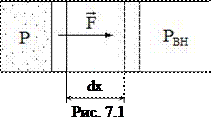 где μ – молярная масса; М/ μ – число молей. Внутренняя энергия идеального газа зависит только от его температуры. Обмен энергией между (ТС) и окружающими ее телами может проходить в двух формах: макроскопической (в форме работы) и микроскопической (в форме теплопередачи, или теплооборота). Работа – это мера обмена энергией между рассматриваемой (ТС) и окружающими ее телами, в результате которого изменяются ее параметры P, V, T. Так, при расширении (ТС) совершает работу против внешних сил и отдает свою энергию. В качестве примера рассмотрим расширение газа в цилиндре с поршнем (рис. 7.1). Предположим, что газ расширяется равновесно, т. е. в любой момент времени внешнее давление Рвн практически равно давлению газа под поршнем Р. При перемещении поршня на dх сила F совершает работу dА = Fdх и создает давление на поршень. Работа газа dА = Fdx=РSdx = РdV, где dV – приращение объема при перемещение поршня площадью S на dx. При изменении объема газа от V1 до V2 работа