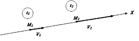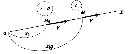 Рассмотрим два классических примера прямолинейного движения материальной точки. Равномерным называется движение частицы, если её координата является линейной функцией времени x (t) = A + B t. (1.9) Здесь А и В — постоянные величины. Пусть в момент начала отчета времени t = 0, частица проходит на оси x точку М 0, координата которой x (0) = x 0 (рис. 1.6)