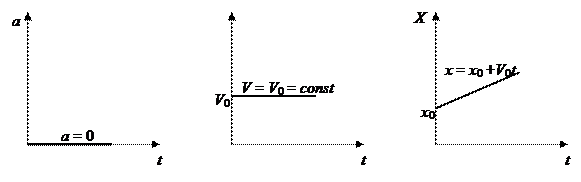 Коэффициент В в уравнении движения (1.9) — его неизменная скорость. Следовательно, равномерное движение происходит с постоянной скоростью. Воспользовавшись полученными результатами (1.10) и (1.11), запишем кинематическое уравнение равномерного движения (1.9) в стандартном виде x (t) = x 0 + V 0 t. (1.12) Ускорение такого движения Графики равномерного движения приведены на рис. 1.7.