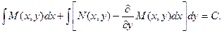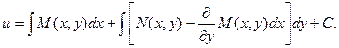 Интегрирование такого уравнения сводится к нахождению функции u, после чего решение легко находится в виде: Таким образом, для решения надо определить: 1) в каком случае левая часть уравнения представляет собой полный дифференциал функции u; 2) как найти эту функцию.