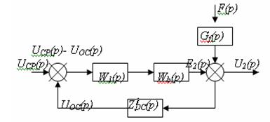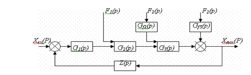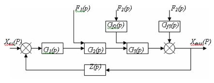 Прямая цепь системы состоит из последовательно включенных звеньев направленного действия с передаточными функциями G1(р), G2(р), G3(р). На входы двух последних звеньев поступают возмущающие воздействия F1(р) и F2(р), суммирующиеся с соответствующими выходными величинами предыдущих звеньев. Кроме того, возмущение F3(р) действует непосредственно на выходную величину системы, что обозначено на схеме специальным элементом суммирования. При этом принципиально важно, что место приложения возмущения F3(р) охвачено обратной связью, т. е. на звено с передаточной функцией Z(р) поступает выходная величина системы уже с учетом действия F3(р). В противном случае никакого эффекта регулирования не было бы, так как управляемая величина системы, искаженная влиянием возмущающего воздействия, не корректировалась бы обратной связью. Из структурной схемы (рисунок 3.2) видно, что возмущающие воздействия F2(р), F3(р) поступают на входы звеньев прямой цепи системы не непосредственно, а через дополнительные звенья с передаточными функциями G j1(р), G j3(р), которые отражают характер зависимости данной величины системы от конкретного возмущающего воздействия. В силу линейности рассматриваемой системы управления, к ней применим принцип наложения, дающий возможность определить общую реакцию системы (изменение выходной величины как сумму частных реакций от каждого из внешних воздействий в отдельности). Положим