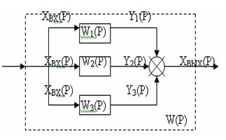 Итак, передаточная функция последовательно включенных звеньев равняется произведению передаточных функций отдельных звеньев. Параллельное, согласное включение. Параллельным согласным включением звеньев направленного действия считается такое, при котором входная величина системы подается параллельно на входы всех звеньев, а их выходные величины алгебраически суммируются на выходе системы. На рисунке 4.2 изображен частный случай параллельного согласного включения трех звеньев направленного действия.