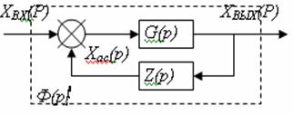 Таким образом, передаточная функция параллельных согласно включенных звеньев направленного действия равняется алгебраической сумме передаточных функций отдельных звеньев. Параллельное встречное включение (обратная связь). Рассмотрим сначала основной случай - отрицательную обратную связь. На рисунке 4.3. изображена структурная схема замкнутой системы автоматического управления в наиболее общем виде, где G(р) и Z(р) - передаточные функции соответственно прямой цепи системы и цепи обратной связи. Сигнал обратной связи Хo.с(р) вычитается из входного сигнала Хвх(р) (в случае положительной обратной связи они не вычитаются, а складываются). Передаточные функции G(р) и Z(р) могут соответствовать как простым звеньям направленного действия, так и их любым комбинациям.