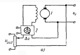 Лекция №6. Статическое и астатическое регулирование Содержание лекции: - статическое регулирование, рассмотрение примеров, основные характеристики; - астатическое регулирование, рассмотрение примеров, основные характеристики. Цели лекции: - изучить принцип построения статического регулятора, основные определения и характеристики; - изучить принцип построения астатического регулятора, основные определения и характеристики. Одной из существенных характеристик систем автоматического регулирования является зависимость между значением регулируемого параметра и величиной внешнего воздействия (нагрузкой) на объект регулирования. По виду таких рабочих характеристик различают статическое и астатическое регулирование. Статическое регулирование. Регулированием со статической характеристикой называется такое, при котором в установившемся состоянии имеется определенная зависимость между величиной отклонения регулируемого параметра от заданного значения и величиной внешнего возмущения, например нагрузкой объекта регулирования. При статическом регулировании величина регулирующего воздействия однозначно связана с отклонением регулируемого параметра от заданного значения. Отсюда следует, что для создания требуемого регулирующего воздействия, устраняющего соответствующее влияние внешнего возмущения, обязательно должно иметь место отклонение регулируемого параметра. Поэтому при статическом регулировании всегда имеется остаточное отклонение регулируемого параметра от номинального значения. Равновесие системы при статическом регулировании для разных нагрузок имеет место при различных значениях регулируемого параметра, лежащих в заданных заранее пределах. Пример статического регулятора приведен на рисунке 6.1, а. Принцип действия этого регулятора достаточно ясно виден из рассмотрения схемы и особых пояснений не требует. Заметим лишь, что требуемое возбуждение генератора 1 осуществляется путем изменения входного сигнала электронного усилителя 2. В свою очередь, этот сигнал пропорционален отклонению регулируемого параметра uГ от заданного значения uЗАД. Поэтому такое отклонение, т. е. наличие Δu, является неизбежным и должно быть тем больше, чем больше изменяется величина внешнего возмущения. Очевидно, что это отклонение регулируемого параметра от заданного значения сохраняется также и в установившемся положении. Рабочая характеристика (зависимость напряжения от нагрузки) статического регулятора, называемого иногда пропорциональным регулятором, приведена на рисунке 6.1, 6. На рисунке 6.1, в показан переходный процесс в системе при уменьшении нагрузки генератора. Выходное напряжение uГ при этом увеличивается с uГ1 до uГ2.