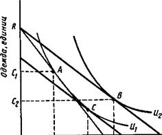 Теперь потребитель выбирает набор в точке В на кривой безразличия U2. Следовательно, снижение цены продовольствия допускает повышение уровня удовлетворения потребностей потребителя — его покупательная способность, или реальный доход, возросла. Общее изменение в потреблении продуктов питания вызвано более низкой ценой, обозначенной F1F2. Сначала потребитель покупает количество OF1 единиц продовольствия, но после изменения цены потребление продуктов питания увеличилось до OF2. Отрезок линии F1F2, следовательно, представляет увеличение размеров покупок продуктов питания. А что произошло с приобретением одежды? Оно снизилось с ОС1 до OC2 — снижение, представленное отрезком C1C2. Запомним, что продовольствие относительно недорого, тогда как одежда относительно дорога. Падение цены отражается в эффекте замещения и эффекте дохода. Эффект замещения представляет собой изменение потребления продуктов питания, связанное с изменением их цен, при условии, что степень удовлетворения (или реальный доход) остается неизменным. Эффект замещения охватывает изменение в потреблении продуктов питания, которое происходит в результате изменения цены, делающего продовольствие относительно более дешевым, чем одежда. Эта замена отражается движением вдоль кривой безразличия. На рисунке эффект замещения может быть измерен проведением бюджетной линии параллельно новой бюджетной линии RT (отражая более низкую относительную цену продуктов питания) — так, чтобы она касалась кривой безразличия U1 (оставляя уровень удовлетворения постоянным). При заданной бюджетной линии потребитель выбирает набор товаров и услуг в точке С и потребляет OE единиц продовольствия. Отрезок линии F1E представляет, таким образом, эффект замещения. Из рисунке видно, что когда цена на продукты питания снижается, эффект замещения всегда ведет к увеличению количества требуемых продуктов питания. Объяснение лежит в нашем предположении, что предпочтения носят выпуклый характер. Для кривых безразличия, показанных на рисунке, точка, которая максимизирует степень удовлетворения на новой бюджетной линии RT, должна лежать ниже и правее первоначальной точки касания. Теперь рассмотрим эффект дохода (т. е. изменение потребления продовольствия, вызванное ростом покупательной способности при оставшихся неизменными ценах на продукты питания). На рисунке эффект дохода отражается в том, что пунктирная бюджетная линия, проходящая через точку С, смещается к бюджетной линии RT. Потребитель выбирает теперь набор товаров В на кривой безразличия U2, а не набор С на кривой U1 (потому что более низкая цена на продукты питания позволила повысить степень полезности потребителя). Рост потребления продовольствия с OE до OF2 выражает эффект дохода, который является положительной величиной, так как продукты питания являются нормальным товаром. Эффект дохода отражает движение от одной кривой безразличия к другой, и, таким образом, с его помощью можно измерять изменение покупательной способности потребителя.