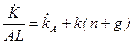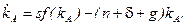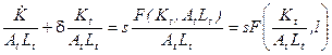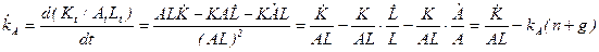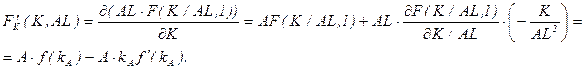 До сих пор мы предполагали, что уровень технологии остается неизменным. В результате все переменные в расчете на одного работника в долгосрочном периоде оказались неизменными. Подобные выводы крайне нереалистичны и противоречат эмпирическим фактам экономического роста, обсуждаемым в начале лекции. Так, в частности, из анализа модели с неизменной технологией мы получили, что капиталовооруженности и производительность труда в долгосрочном периоде должны быть постоянны, в то время как эмпирические исследования говорят о том, что обе эти переменные растут. Посмотрим, поможет ли учет технического прогресса сделать модель более адекватной действительности. Однако сначала нужно решить, каким именно образом учитывать технический прогресс в модели. Принято различать трудосберегающий, капиталосберегающий и нейтральный (по Хиксу) технический прогресс. Нейтральный по Хиксу технический прогресс позволяет произвести тот же выпуск с меньшими затратами как капитала, так и труда, не изменяя пропорции между используемыми факторами: Y=F(K,L,A)=AF(K,L), где А - параметр, характеризующий технологию. Трудосберегающий технический прогресс может быть описан следующей производственной функцией: Y=F(K,L,A)= F(K, AL). Капиталосберегающий технический прогресс ведет к такому же росту выпуска, как и рост используемого капитала: Y=F(K,L,A)= F(АK, L). Если мы будем рассматривать постоянный темп технического прогресса, то есть будем полагать, что Перепишем условие равновесия (10) для модели Солоу, включив во внимание наличие технического прогресса: (18) Обозначим через kA º K/AL и yA = Y/AL капитал и выпуск на единицу эффективного труда, соответственно. С учетом введенных обозначений получаем: (19) Уравнение (19) описывает накопление капитала при наличии трудосберегающего технического прогресса. Определим стационарное состояние, как состояние, в котором капитал на единицу эффективного труда постоянен: Таким образом, долгосрочный темп экономического роста (рост выпуска на душу населения при полной занятости) согласно модели Солоу определяется исключительно темпом технического прогресса. Проанализируем, насколько приблизилась модель к объяснению эмпирических закономерностей роста при введении в рассмотрение технологического прогресса. Заметим, что теперь капиталовооруженность и производительность труда в долгосрочном периоде не являются постоянными, а растут с постоянным темпом, что полностью соответствует описанным Калдором эмпирическим закономерностям. Что касается отдачи на факторы производства, то и в этом вопросе полученные из анализа модели результаты согласуются с эмпирическими исследованиями, поскольку отдача на капитал является постоянной, а отдача на труд растет. Для того, чтобы в этом убедиться рассмотрим отдачу на капитал в стационарном состоянии. Предельный продукт капитала определяется как