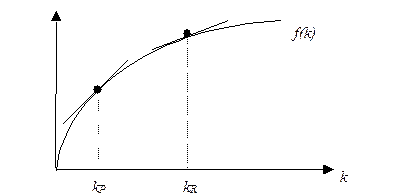 Таким образом, учитывая, что Модель Солоу объясняет долгосрочный экономический рост экзогенным показателем, отражающим темп технического прогресса. При этом остается непонятным, что определяет этот темп и может ли экономическая политика способствовать увеличению темпов экономического роста. Другая проблема, связанная с моделью состоит в том, что согласно модели Солоу различия в производительности труда между богатыми и бедными странами являются результатом различий в уровнях капиталовооруженности, что, в свою очередь, объясняется различиями в нормах сбережения, амортизации, темпах роста населения и темпах технического прогресса. Рассмотрим две экономики с одинаковой технологией, но разным уровнем капиталовооруженности (см. рис.8).