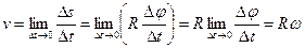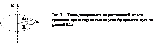 Отметим, что при поворотах оси вращения угловое ускорение e отлично от нуля даже в том случае, когда dw/dt=0. Угловое ускорение измеряется в радианах в секунду за секунду (рад/с2). Найдем связь векторов w и e с величинами v и а, которые, чтобы отличить от угловых называют линейными скоростью и ускорением. Из рис. 2.1 следует, что точка тела, отстоящая от оси вращения на расстоянии R, при повороте тела на угол Dj проходит путь Ds=RDj. Разделив Ds на время Dt, за которое произошел поворот тела на угол Dj, и осуществив предельный переход, получим модуль линейной скорости точки: