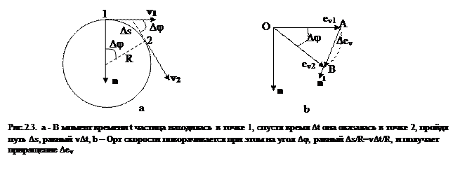 Движение по криволинейной траекторииПри равномерном движении по криволинейной траектории Представив скорость в виде v =v e v (2.8) (e v-орт скорости v), рассмотрим два частных случая; 1) движение по прямолинейной траектории и 2) равномерное движение по окружности. 1. При прямолинейном движении e v=const, изменяется только v, поэтому а = Из этого выражения следует, что в случае, когда скорость со временем увеличивается (т.е. 2. При равномерном движении по окружности v=const, изменяется только е v, поэтому а =v Из рис.2.3 следует, что за время Dt орт скорости поворачивается на угол Dj=vDt/R и получает приращение Dеv. По определению производной