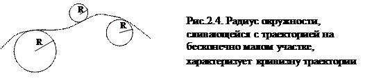 Как мы и предполагали, быстрота поворота вектора скорости (т.е. поворота е v) оказалась пропорциональной модулю скорости и кривизне траектории. (В случае окружности кривизна траектории характеризуется величиной, обратной радиусу.) Подставив найденное значение а n= Таким образом, при равномерном движении по окружности ускорение определяется выражением (2.12). Направлено ускорение по нормали к скорости. Поэтому его называют нормальным ускорением и в обозначении его ставят индекс n. Каждой точке произвольной искривленной линии можно сопоставить окружность, которая сливается с линией на бесконечно малом участке (рис.2.4).